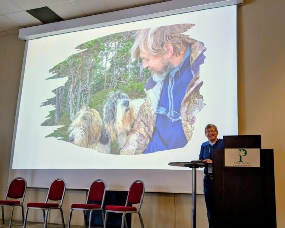 Johan Trygve Solheim heldt foredrag om bruk av drivande hundar på hjortejakt. Her med ein plansje der han filosoferer om eigar og hund vil likne kvarandre etter ei tid.